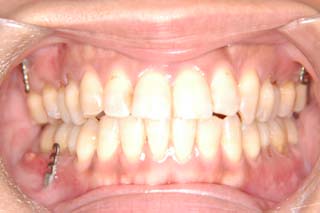装置撤去です。動的処置は2年弱でした。十分とは言えない点もありますが、患者希望による非抜歯配列でしたので、概ね良好と言える結果が得られたと思います。まだ、オーソアンカー SMAPがそのまま残っているのが見えますが、もう必要ないので撤去して貰う予定です。今後は保定治療に移行し、咬合の安定状態を管理していきます。