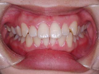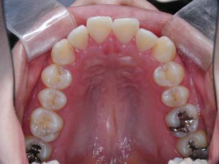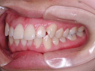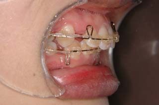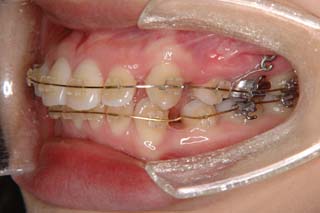 上顎前歯、下顎前歯の前突が見られます。大きな叢生は見られませんが、上下の口唇前突感も伴います。このような不正咬合を上下顎前突と言います。審美的な事もさることながら、歯軸の傾斜の問題から歯にかかるベクトルが良くない事、口唇の筋肉の緊張を強いるような不調和を示す事などから、不正咬合の一つとして考えられています。上顎前突傾向も伴っていますので、積極的に上顎前歯の後退を行う目的で、上顎に固定源となる 目的外使用の オーソアンカー SMAPシステム を装着しました。現在では、歯科矯正用アンカースクリュー(デュアルトップオートスクリュー、ISAアドバンスなど)といった、医療機器認証番号がある製品を用いることが多くなりました。