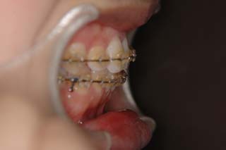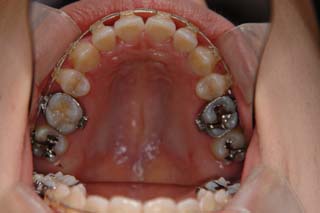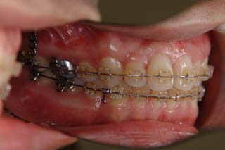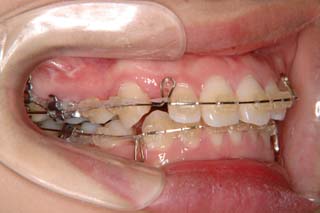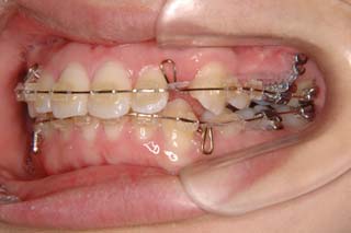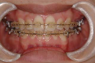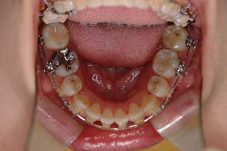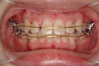 最終仕上げの段階です。かなり太めのワイヤーが入っていますが、このワイヤーの後にオーバーコレクション(元々の歯の捻れが有った場合、後戻りで出てきやすいので、わざと過剰に捻れを治しておく事)を行うための、細めのワイヤーを使う事もあります。