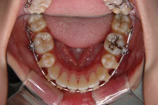 装置撤去直前です。動的処置は2年6か月でした。概ね良好な咬合状態が得られたと思います。今回のように、第二大臼歯の抜歯、親不知の配列を行うと、ケースによっては萌出待ちのため時間がかかってしまう事もあります。幸い、問題のない位置に親知らずが萌出してきました。