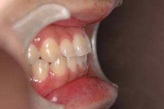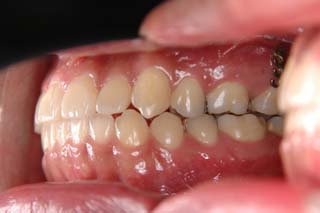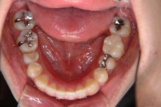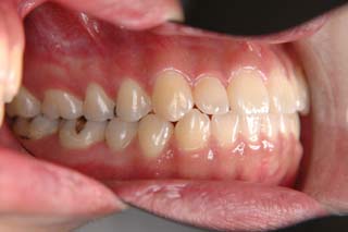 左側の臼歯部干渉が、治療を通じてみられたので、オーバーコレクション気味に軽い臼歯部開咬にしてあります。咬合器上での顎位の偏位はかなり軽減し、頭頚部の症状も随分軽快したようです。歯列の改善と、顎関節症状には、なんだかの関連があると推測されますが、不明なことが多いです。