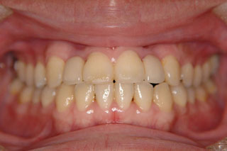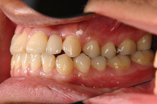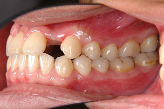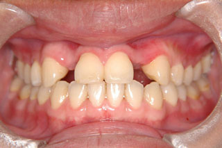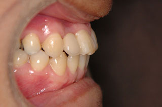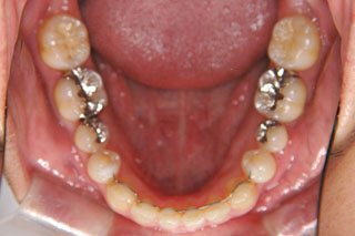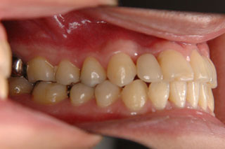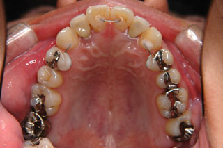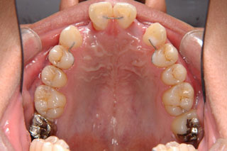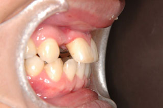 2年半ほどの治療で、装置を撤去し保定治療に移行しています。2番目の側切歯には人工的な歯を入れるため、インプラントをする事になりました。この時点で欠損部の粘膜の下にはフィクスチャーが埋入されています。