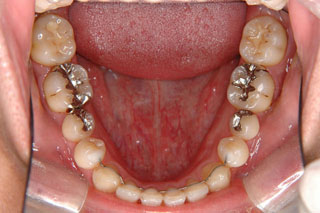 保定治療に移行してから2年半が経過しました。インプラントの上部構造も装着され、咬合も安定している状態です。下顎前突で上顎側切歯に先欠があると、下顎の小臼歯抜歯で対応する事も多いかも知れませんが、出来れば上顎の犬歯と下顎の犬歯を咬合させた方が、長い目で考えるとメリットが多いと考えています。