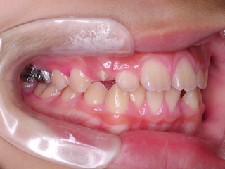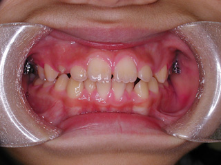 前歯の噛み合わせがしっかり出来ました。ベロのクセを取り除く装置と、トレーニングを併用し、上顎と下顎の骨のズレとなってきた顎の関係を改善する装置を使って貰いました。残念なことに下の前歯にはガタガタが出てきたので、今後どのように解決するか検討中です。開咬傾向が強いケースでは結果的に抜歯を行った方が安定性が高いので、将来的にはその様なことも視野に入れておいた方が良いかもしれません。小学生の時期から行う治療にて、よりよい環境にはなりますが、全ての問題が解決するわけでは有りません。よりよい歯並びと噛み合わせのために、中学生以降の本格的な矯正治療(マルチブラケット治療)が必要になることも多いです。