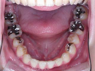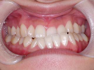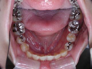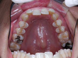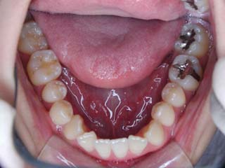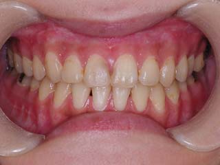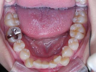 比較的強い叢生と、下顎の劣成長を伴う開咬が見られます。成長を終了した永久歯列ですので、骨の大きさのズレへのアプローチは大きく別れる所です。程度が小さければ、歯の傾きで補うように解決しますし、大きなズレであれば、外科的に骨のズレを改善する治療が選択されます。垂直的な問題はその他の不正咬合と比較して、解決が極めて困難な事が多いです。治療後の後戻りが頻繁に見られる不正咬合ですので、外科矯正での改善が望ましい場合も多いでしょう。