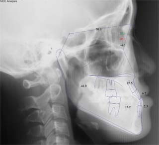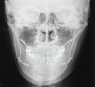極めて強い側方変位を認めます。前後的・垂直的な問題は見られません。大きなズレであれば、外科的に骨のズレを改善する治療が選択されます。横断的な問題はその他の不正咬合と比較して、解決がかなり難しい事が多いです。治療後の後戻りが頻繁に見られる不正咬合ですので、外科矯正での改善が望ましい場合も多いでしょう。