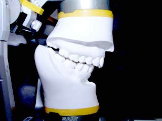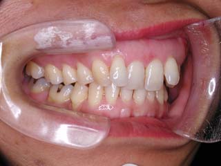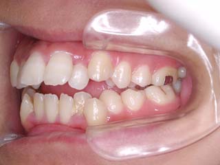 強い骨格性の上顎前突が見られます。しばしば、口腔内所見では骨格のズレを歯の補償的な傾斜などでカムフラージュさせているため、あまり大したことのないズレにしか見えない事があります。また、上顎前突の場合は、下顎が関節の位置で知らず知らずのうちに前方へ大きく偏位させて噛んでいる事が多いです。このような場合は、咬合器に装着してみて初めて、治療方針が見えてくるかもしれません。どのような不正咬合であれ、大きなズレに対しては、外科的に骨のズレを改善する治療が理にかなっています。前後のズレ、垂直のズレと条件が重なってきた場合、より外科矯正での改善が望ましいでしょう。